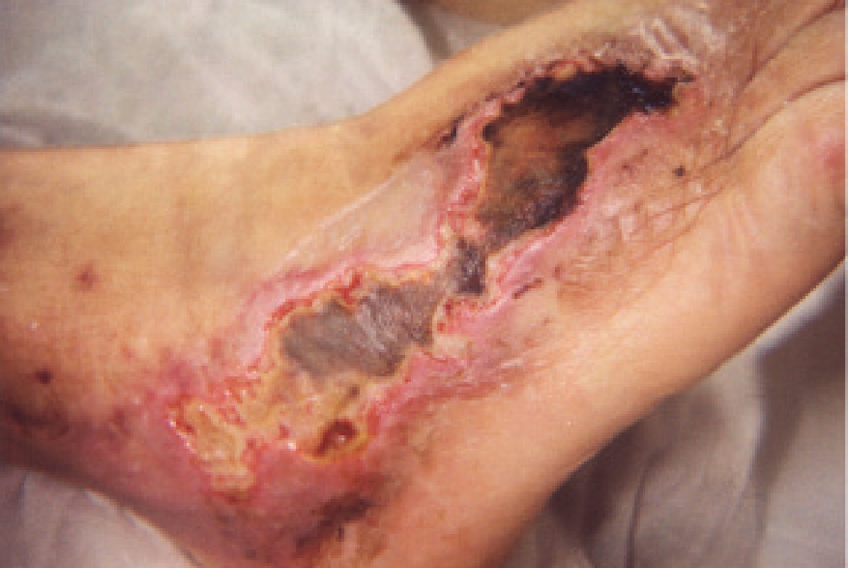 A 56 year old man with a history of ulcerative colitis who was diagnosed with a perforated bowel with faecal contamination. An urgent bowel resection was performed and the patient was subsequently transferred to ITU for management. During his stay in ITU the patient required high levels of inotropic support which resulted in the development of peripheral tissue necrosis.