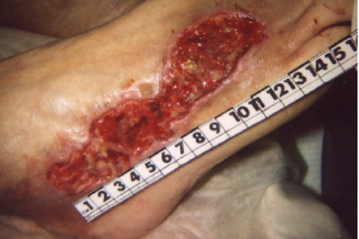 Day 1. Wound assessment was performed by the Vascular Nurse Specialist and found to have a competent vascular system with palpable pulses. He had necrotic areas to both feet which were isolated to the lateral side and full tissue depth.