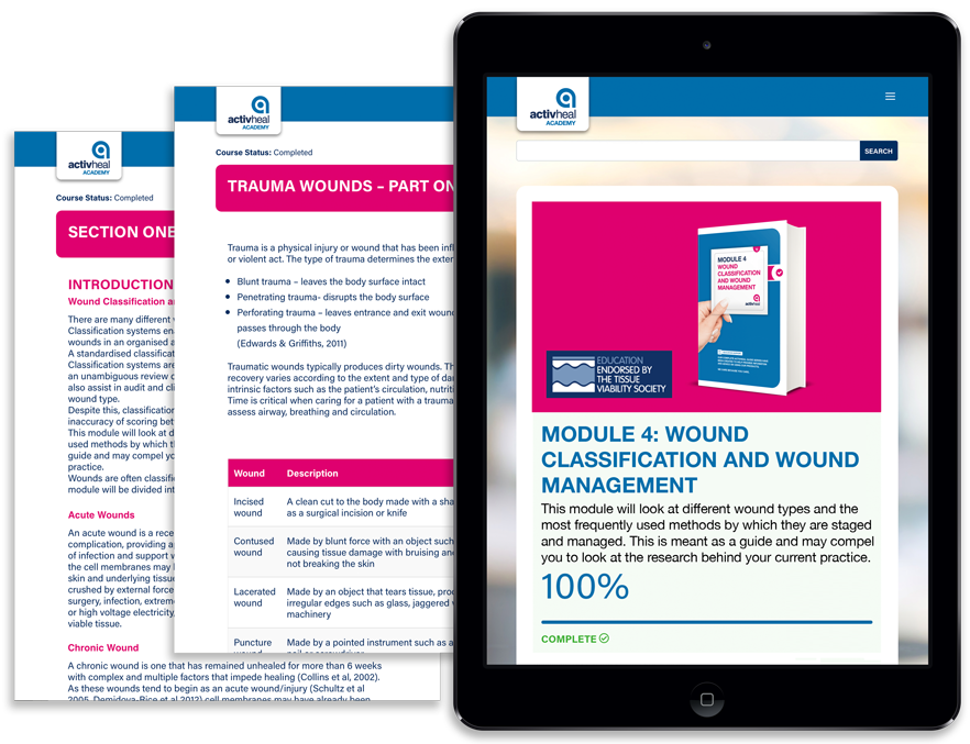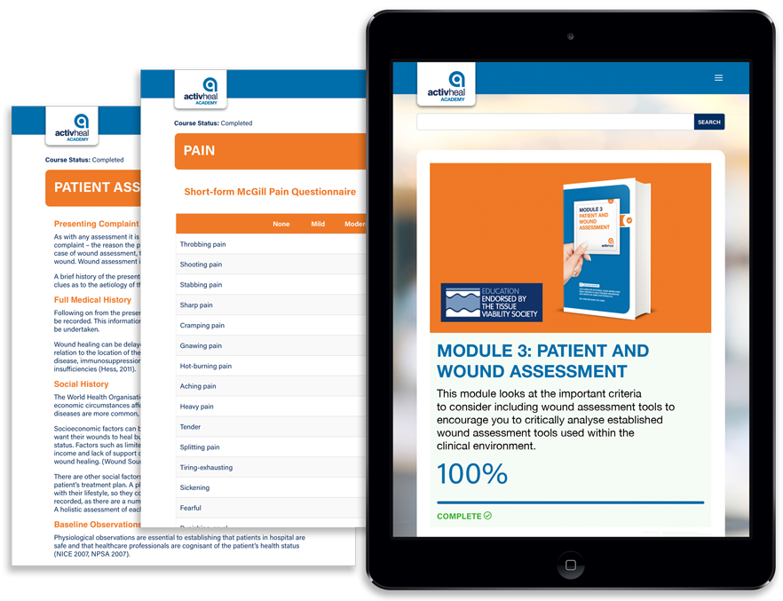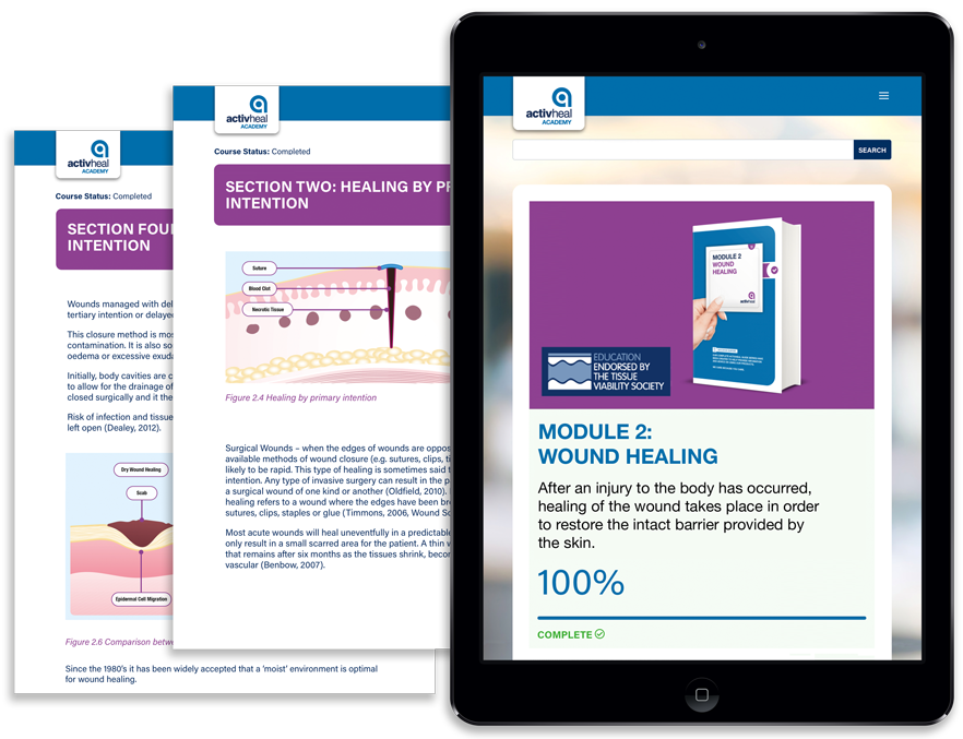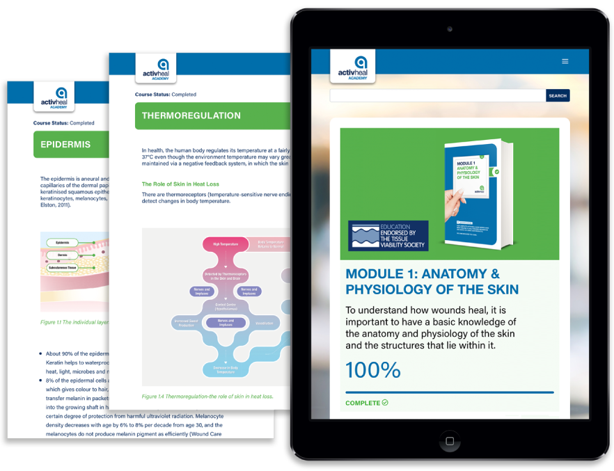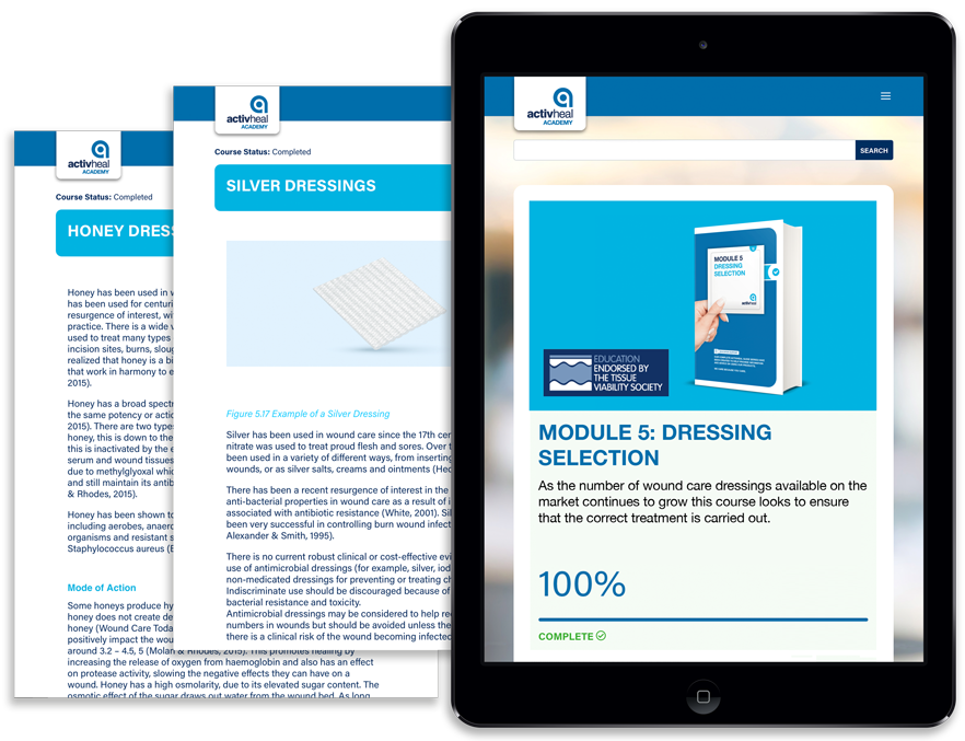 The ActivHeal® Academy is an online learning platform for clinicians of all levels. With nine simplified guides and five higher-tier modules, the courses are freely available for health care professionals to assist in their day to day practice while supporting their Continuing Professional Development. We are proud to be working with the Tissue Viability Society who have endorsed the Academy Higher Modules.